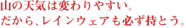山の天気は不安定になりやすいので、必ず雨具は入れておきます。