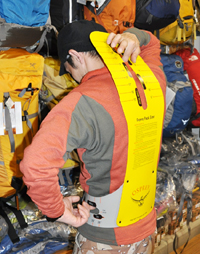 「足の大きさ、幅を計って、足型に合う形状の靴を選ぶとトラブルが少ないし、快適に楽しめます。よく、踵に指1本入るもの(捨て寸)がいいといいます。下り坂で、どうしても足が靴の前にいってしまうとき、その空きがないと当たってしまい、つま先が痛くなったり、爪が死んでしまうことがあり、下りが辛くなります。つま先に適度な余裕は必要ですね」