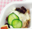 〈材料〉きゅうり1/4本、カッテージチーズ30g、レーズン15g、シーチキン30g、A(塩小1/6、砂糖小1/2、レモン汁小1/2、マヨネーズ大1) <作り方> 1.きゅうりは塩で板ずりし、輪切り。2. レーズンは湯で戻す。 3. 材料をAであえる。