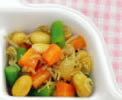 A(醤油小2、砂糖小1弱、ゴマ油大1/2) <作り方>1. インゲンはすじを取りゆでて1cmの長さに切る。人参も1cm角に切りゆでる。 2. ごま油で材料を炒め、Aで味をつける。