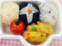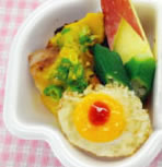 彩りに、プチトマトやうさぎりんご(切ったりんごは、塩水にくぐらせる) |